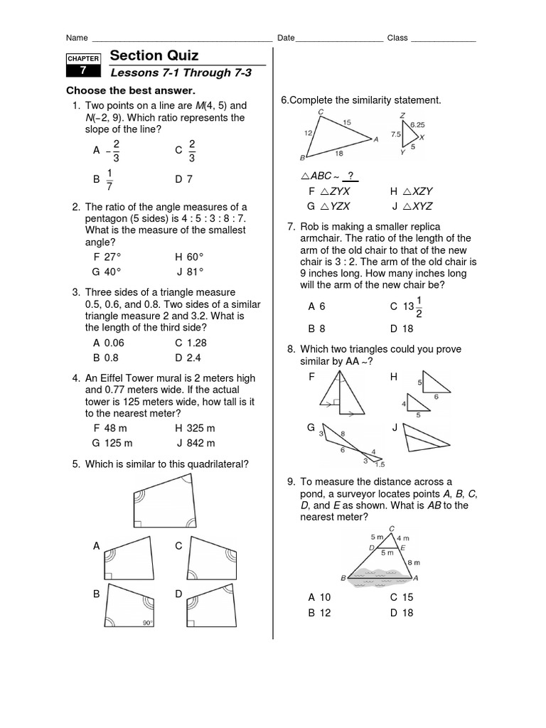 Section Quiz Lessons 7 1 Through 7 3 Pdf Triangle Elementary Mathematics